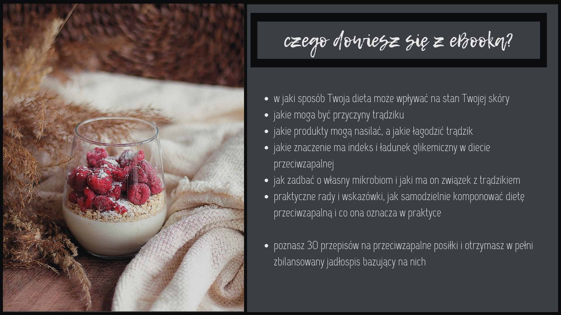 E-Book Przeciwzapalny został stworzony z myślą o każdym, kto zmaga się z trądzikiem i pragnie nauczyć się dbać o swoją cerę od środka. Jeśli pragniesz jeść pysznie i jednocześnie ograniczyć składniki, które mogą pogarszać stan Twojej skóry i poznać te – które wpłyną na jej poprawę, to ten ebook będzie dla Ciebie!