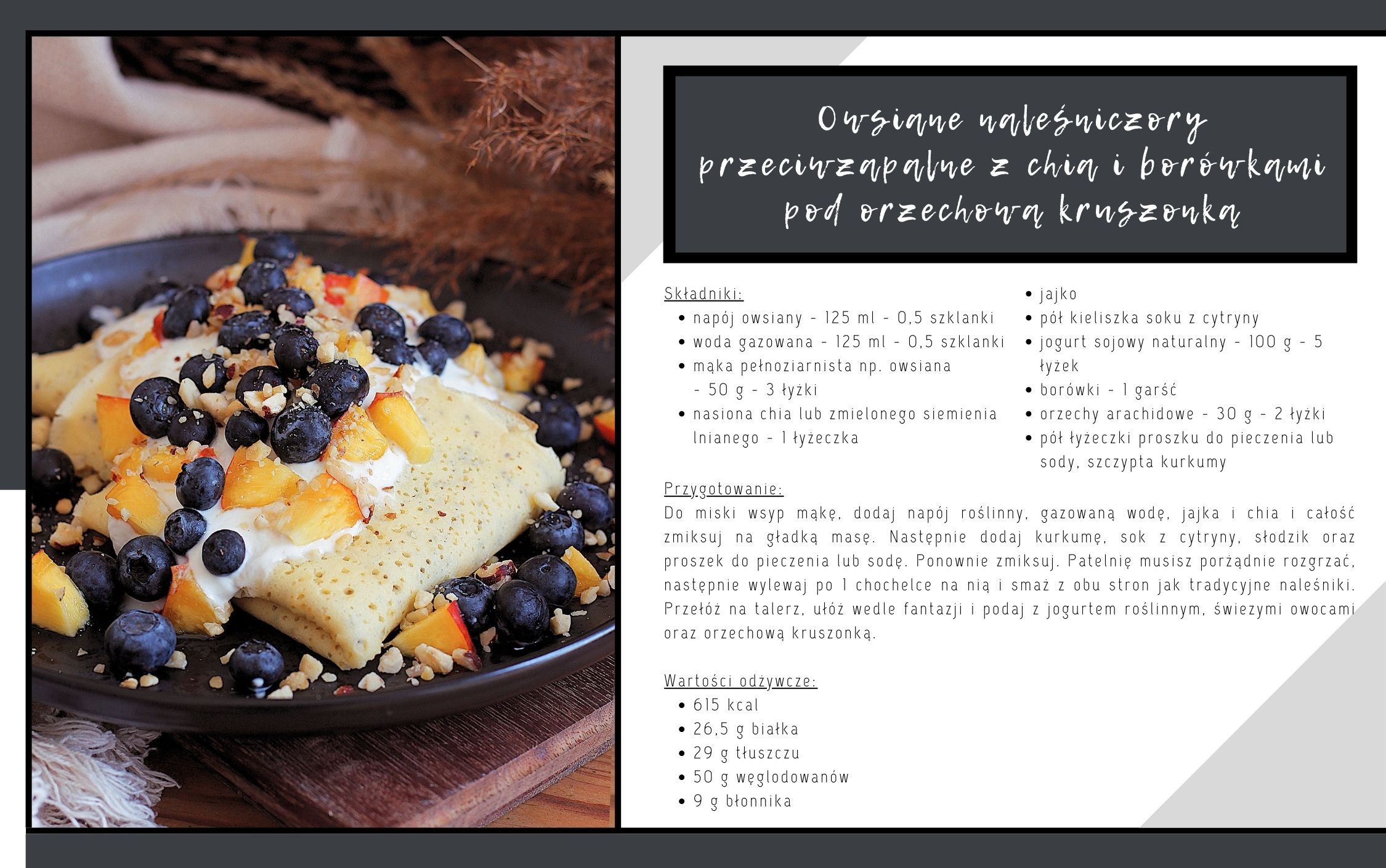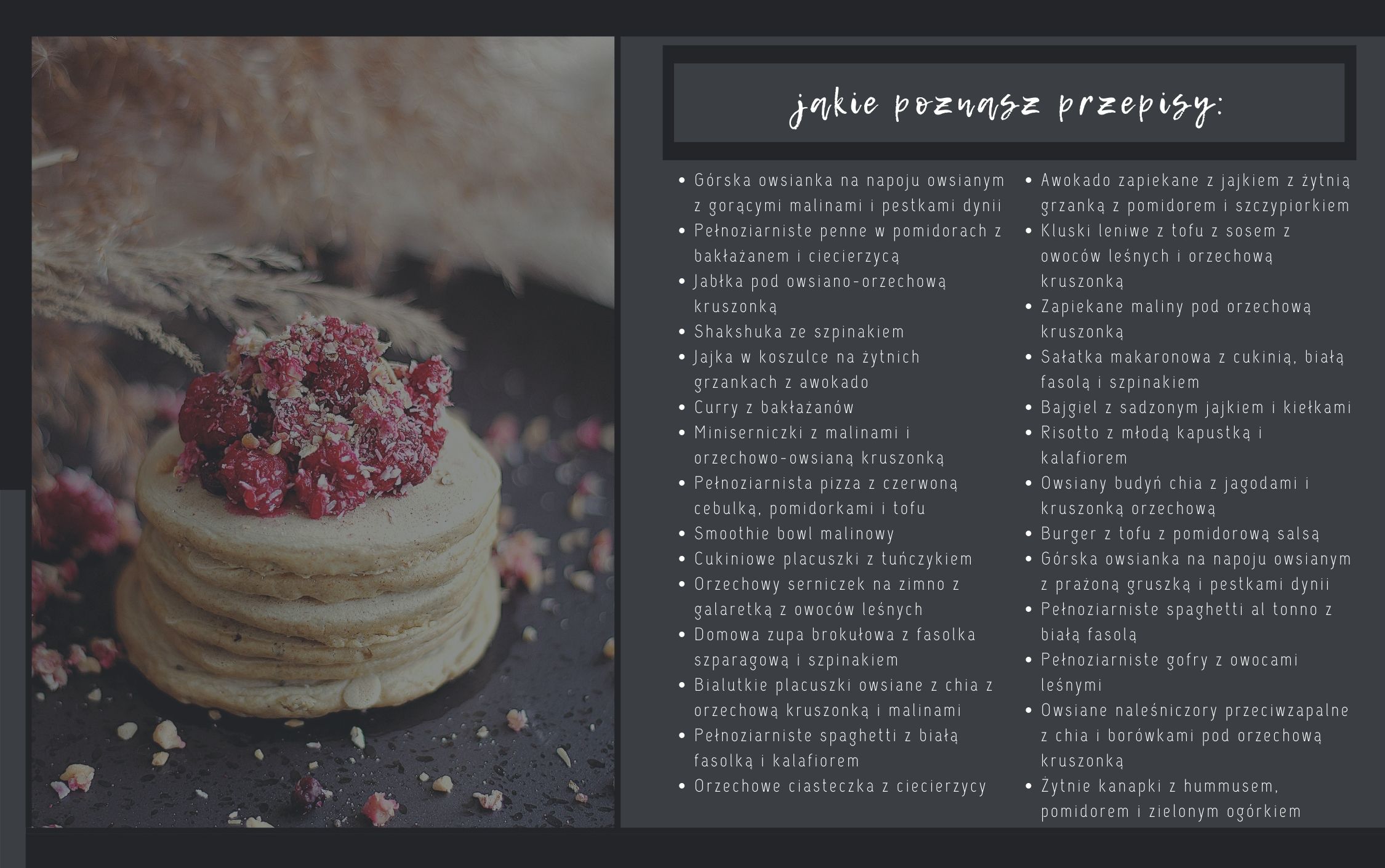 E-Book jest jednocześnie poradnikiem merytorycznym tłumaczącym, w jaki sposób dieta może wpływać na stan skóry, “książką kucharską”, w której znajdziesz 30 przepisów na przeciwzapalne posiłki, czyli zarówno na śniadania, obiady, desery i kolacje, jak również tygodniowym, w pełni zbilansowanym jadłospisem o wartości 1800 kcal, na bazie przepisów z eBooka.